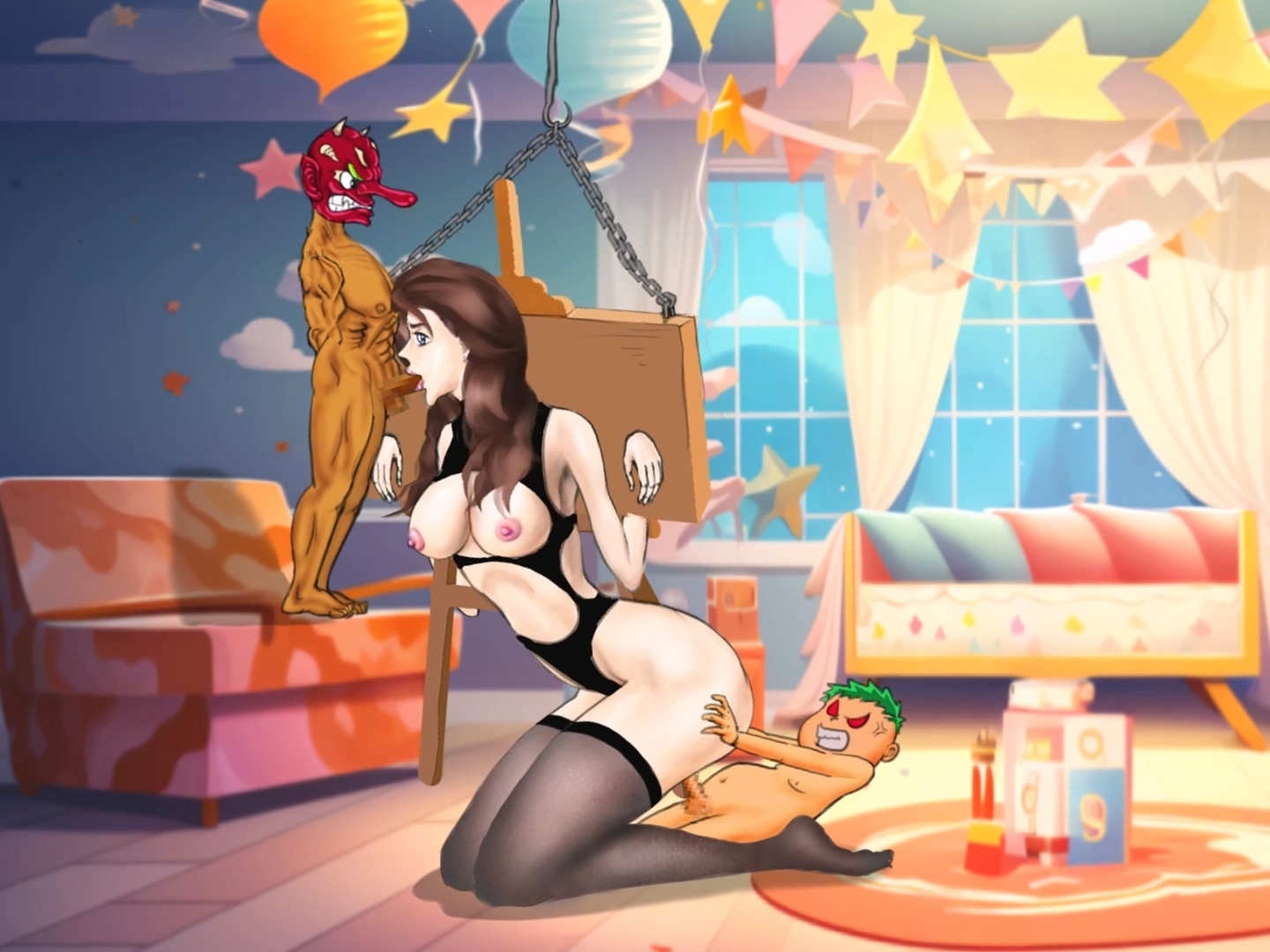 兄はソファに立ち、黒ストッキングを履いた奴○少女は弟に犯されながらフェラチオをした。