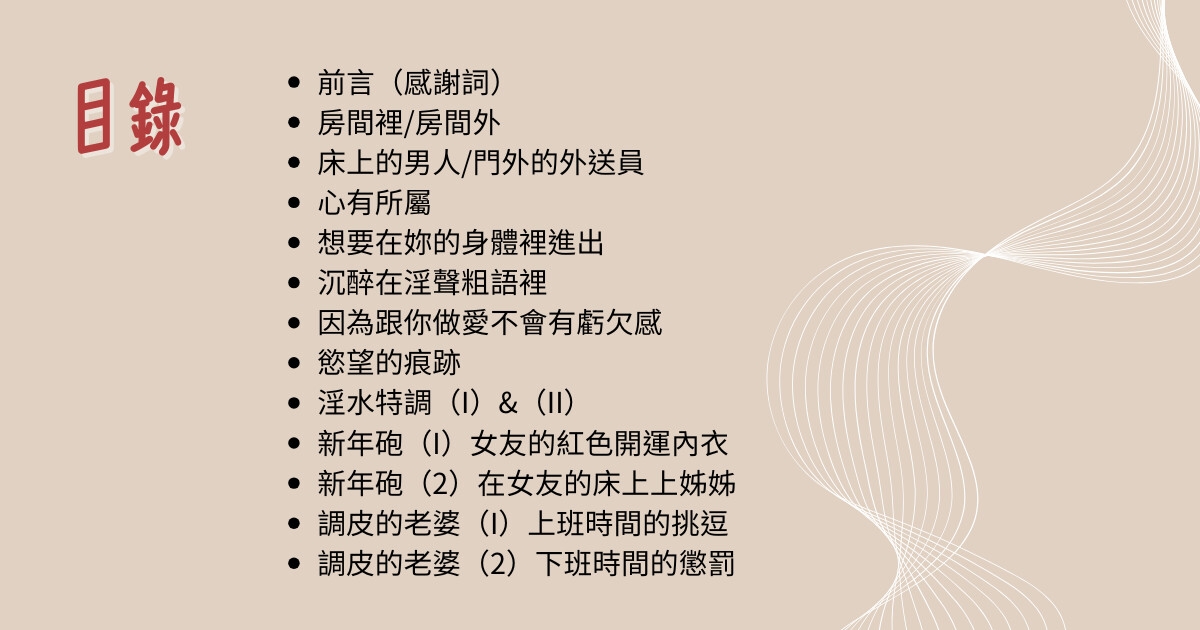 每一篇故事裡或許都有些我暗藏的慾望、幻想,還有看著某些很色的片段時,腦袋突然跑出來的靈感。當它們從腦海的畫面變成文字,再被你閱讀時,就像我們在某個祕密的角落裡,分享了一段只屬於我們的小祕密。