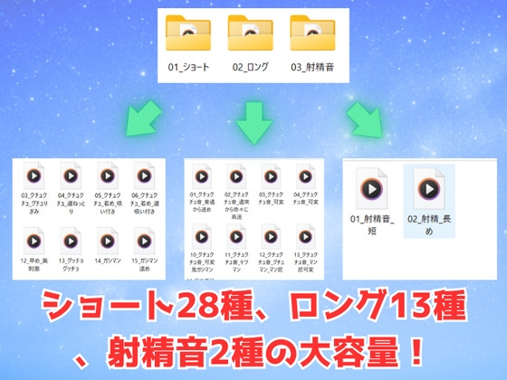 ゲームで使いやすいショートタイプのクチュクチュ音、エロアニメで使いやすいロングタイプのクチュクチュ音と分かれている親切設計!オマケで射精音も2つ追加!