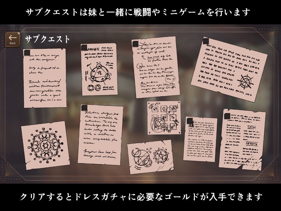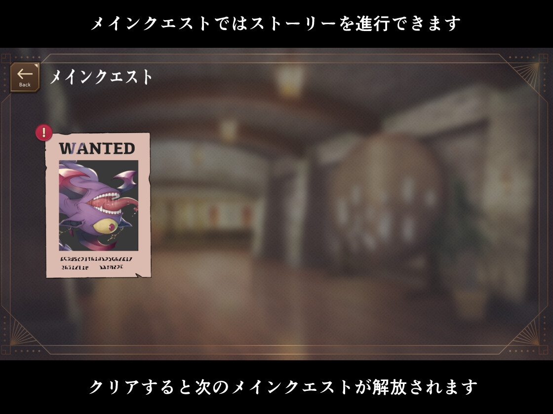 メインクエストは妹が勇者として活躍するストーリーです。クリアすると次のクエストが解放されます。