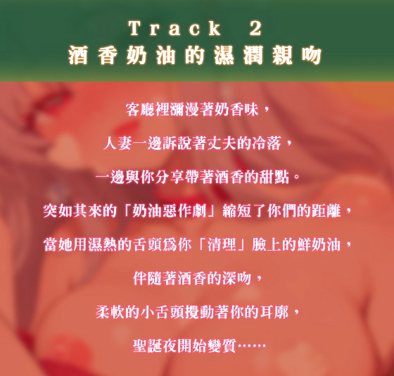 客廳裡瀰漫著奶香味,人妻一邊訴說著丈夫的冷落,一邊與你分享帶著酒香的甜點。突如其來的「奶油惡作劇」縮短了你們的距離,當她用濕熱的舌頭為你「清理」臉上的鮮奶油,伴隨著酒香的深吻,柔軟的小舌頭攪動著你的耳廓,聖誕夜開始變質……
