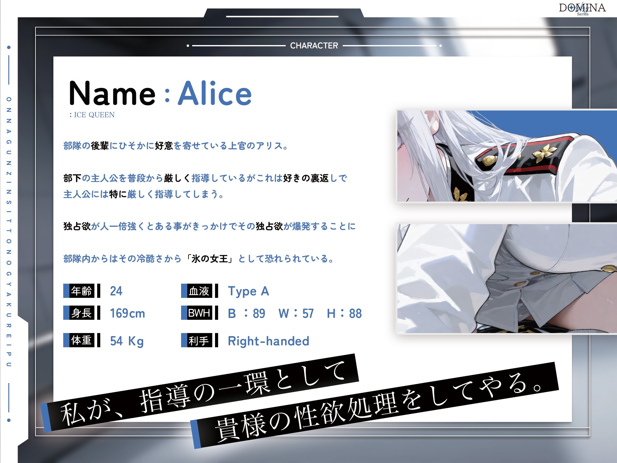 部隊内からはその冷酷さから「氷の女王」として恐れられている。