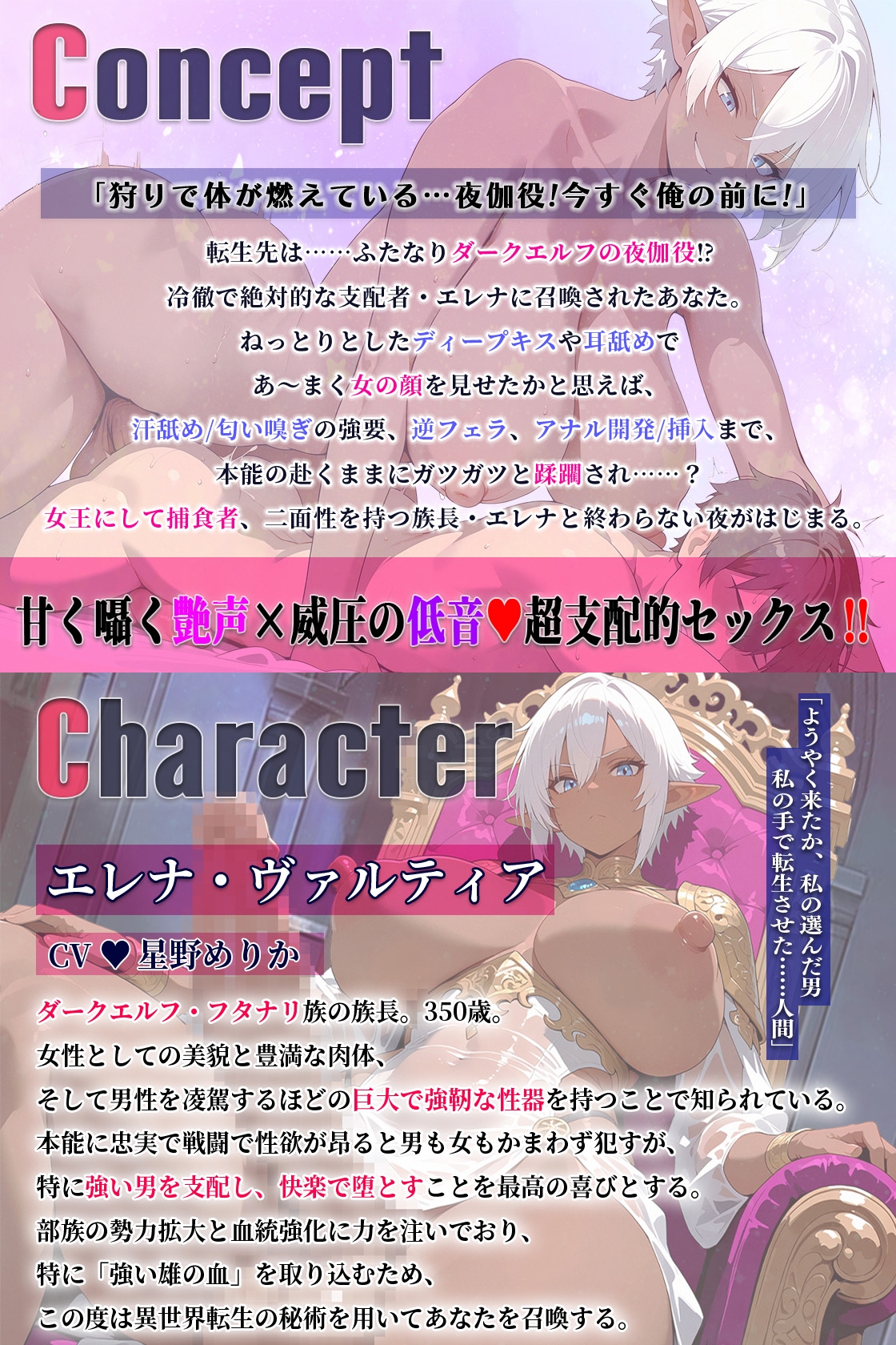「狩りで体が燃えてる…夜伽役!今すぐ俺の前に!もう限界だ!欲しくてたまらん…っ!」ふたなりダークエルフの族長・エレナの夜伽役として異世界召喚させられたあなた。最初はねっとりディープキスや耳舐めで誘惑、狩りから帰るとドスの効いた声に豹変、汗まみれの全身舐め匂い嗅ぎ強要、逆フェラ、アナル挿入と威圧感のある支配者として本能のままに蹂躙。支配し、マゾメス堕ちさせることを最高の喜びとする族長に毎夜何度も犯され続けます