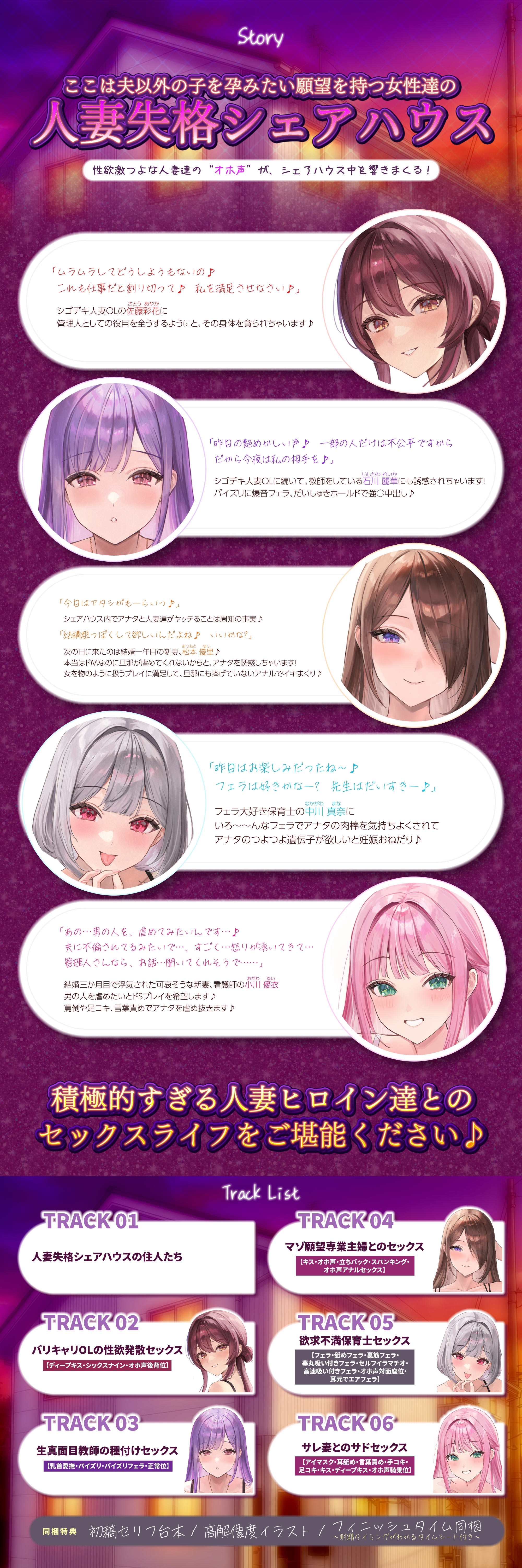 CV:御苑生メイ 様/葵時緒 様/分倍河原シホ 様/佐倉もも花 様/御子柴泉 様が演じる、積極的すぎる人妻ヒロイン達とのセックスライフをご堪能ください♪