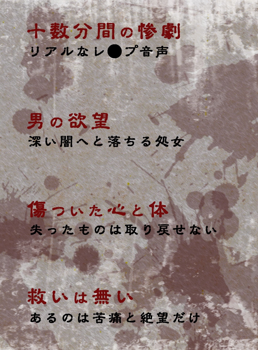 無理やり犯され、嫌がり、痛がり、悲しみ、あきらめ、絶望する処女の声です。男の欲望の捌け口にされるだけの苦痛の時間。ペニスを入れられても、痛みと嫌悪感だけがあり、決して感じることはない。そんな女の声をお届けします。