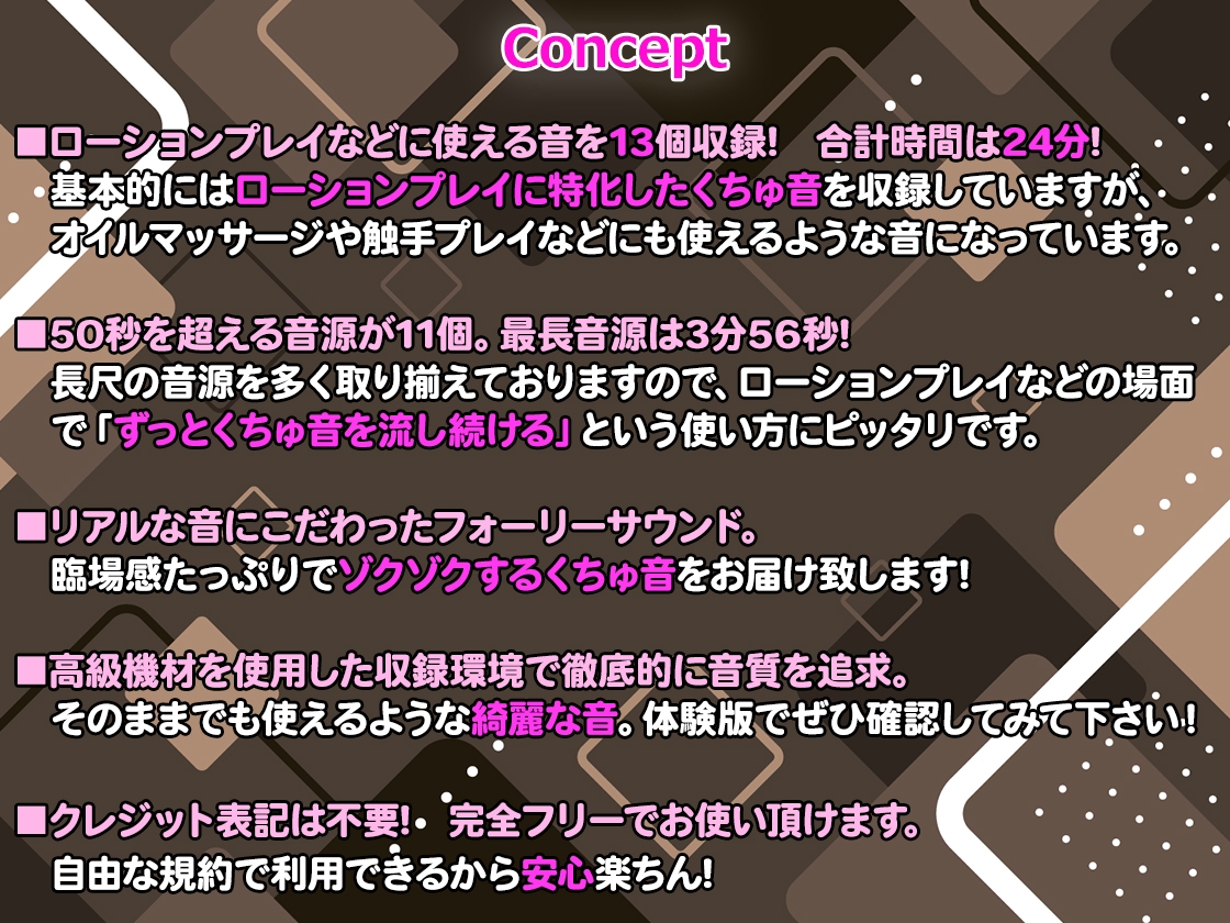 ローションが絡み合うローションプレイにピッタリな効果音を多数収録。