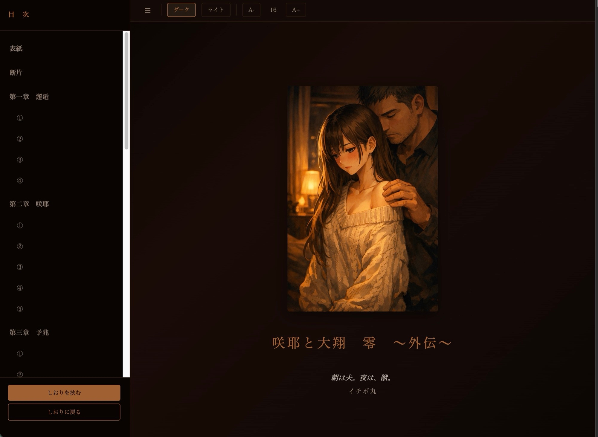 「咲耶と大翔 初」の前日譚——咲耶の両親の、出会いから結婚、そして変容していく夫婦の夜を描く長編です。