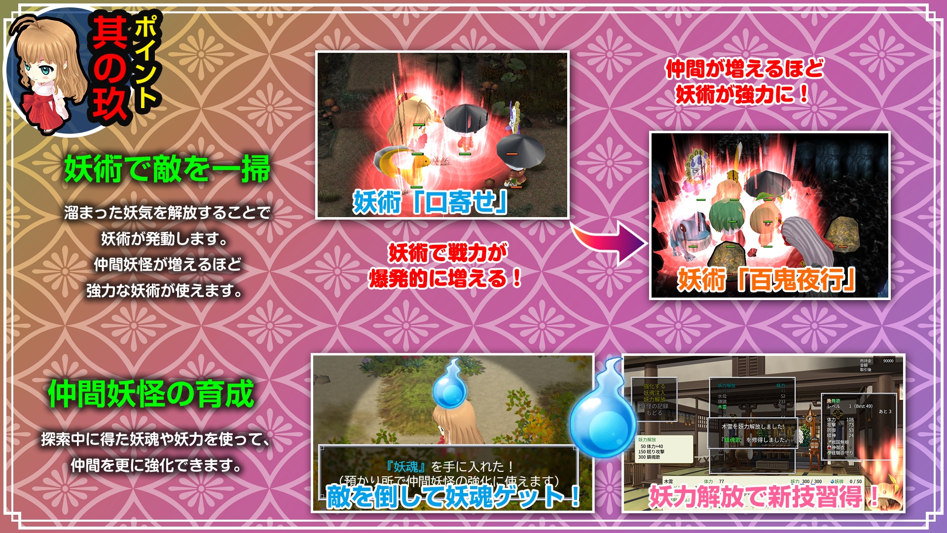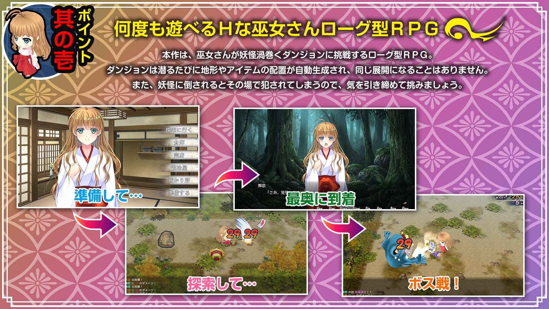 「何度も遊べる巫女さんローグ型 RPG」である「神楽黎明記(かぐられいめいき)」と同じくお手軽に「毎回タイプの違うヒロインと妖怪との異種姦」を楽しめます。