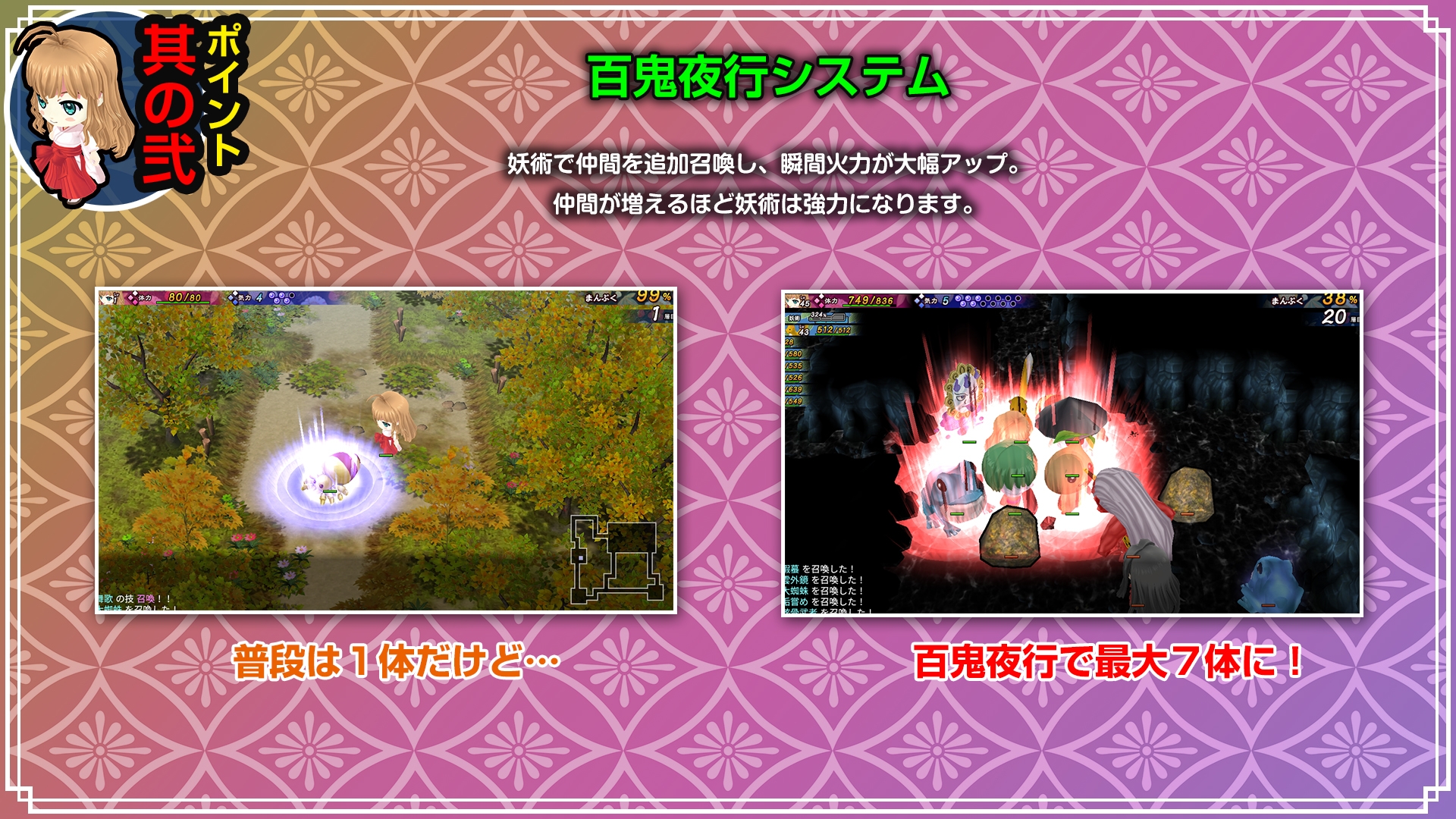 バトルキャラを3D化し、これまでの神楽黎明記シリーズで好評の「百鬼夜行システム」や「妖魂ふりわけシステム」などを搭載。